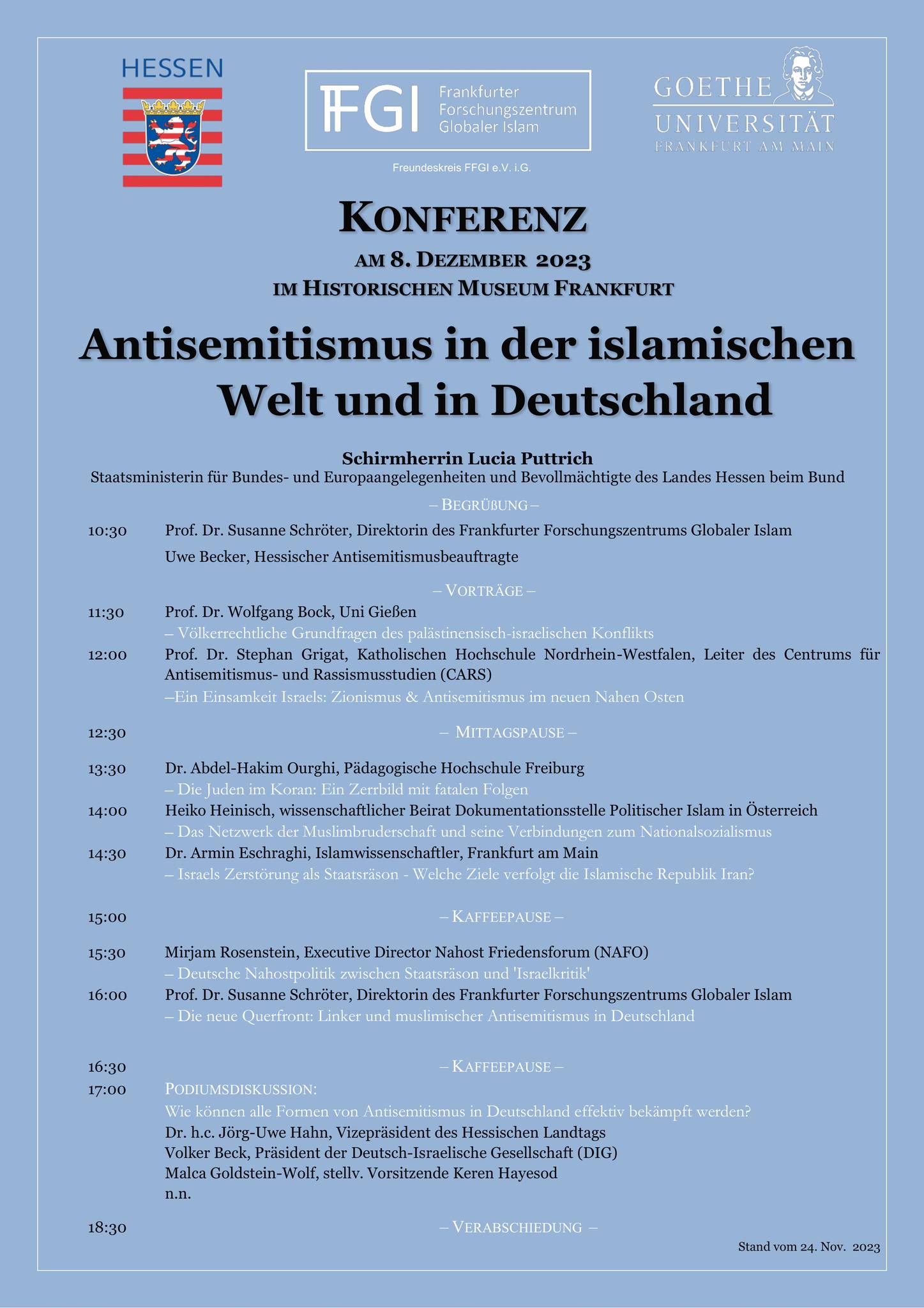 Freitag, 8. Dezember 2023 Frankfurt am Main, 11:00 Uhr Die Einsamkeit Israels. Zionismus & Antisemitismus im neuen Nahen Osten Vortrag von Stephan Grigat bei der Konferenz „Antisemitismus in der islamischen Welt & in Deutschland“ des Frankfurter Forschungszentrums Globaler Islam (FFGI), Historisches Museum Frankfurt, Am Römerberg, Saalhof 1 Link zum Flyer |