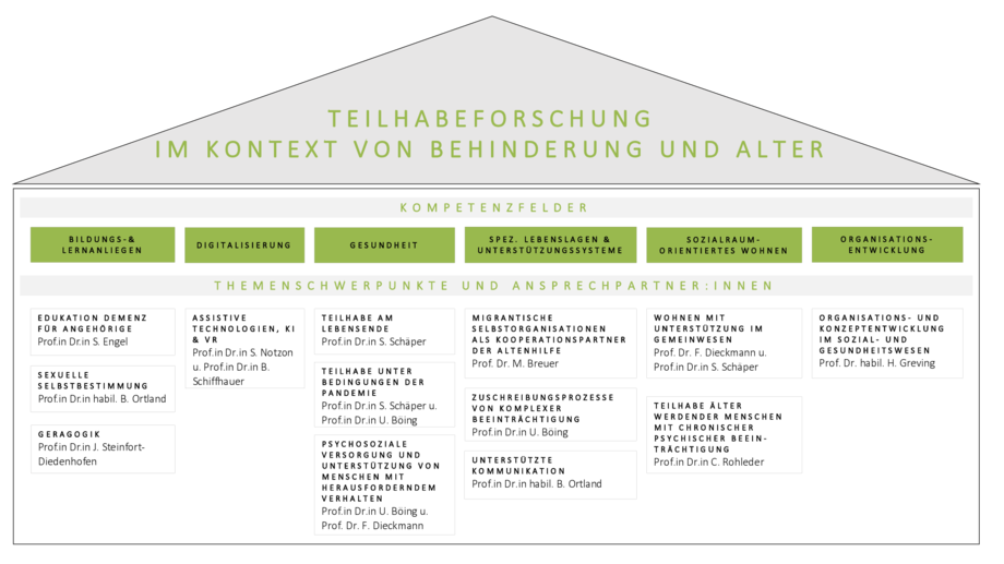Inhaltlich strukturiert sich das Institut für Teilhabeforschung in fünf Kompetenzfelder: