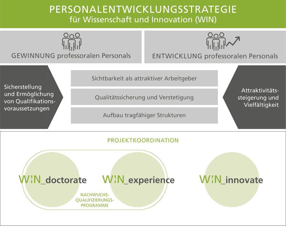 Zur Umsetzung der Ziele beinhaltet die Personalentwicklungsstrategie der katho ein Drei-Säulen-Konzept. Die drei Maßnahmen WIN_doctorate, WIN_experience und WIN_innovate arbeiten eng verzahnt. Sie werden mit Mentoring-Programmen kombiniert und von den Querschnittsthemen Digitalisierung, hochschuleigenes Qualitätsmanagement sowie Gleichstellung und Diversity begleitet.