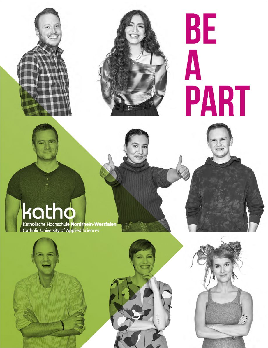 Die Imagebroschüre BE A PART präsentiert die katho als einen Ort, an dem jede_r gerne lernen, lehren und arbeiten möchte. Die Publikation zeigt Hochschul-Angehörige in ansprechenden Fotos und beschreibt Vorzüge der katho in prägnanten deutsch- und englischsprachigen Texten.