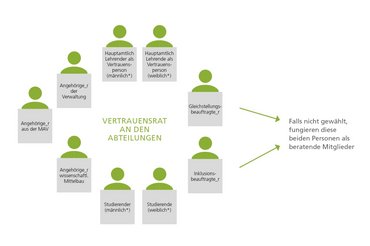 Die bereits skizzierte starke Beteiligungsorientierung bildet sich auch in den, in der Richtlinie grundgelegten, Elementen zur Prävention von und zum Umgang mit sexualisierter/sexueller Belästigung/Diskriminierung und Gewalt ab: Ein zentrales Element sowohl in der präventiven Arbeit als auch im Beschwerdeverfahren bildet der Vertrauensrat. Er besteht aus Vertreter_innen aller Statusgruppen der jeweiligen Abteilung, welche von den Angehörigen der jeweiligen Statusgruppe gewählt werden. Vorsitzende und Vertretung werden aus dem Vertrauensrat heraus gewählt.