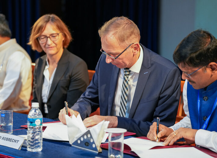 Kanzler Bernward Robrecht, Rektorin Barbara Schermaier-Stöckl und die indischen Kollegen unterschreiben im November 2024 das Collaboration Agreement für das Centre for Ecological and Social Sustainability (CESS).
