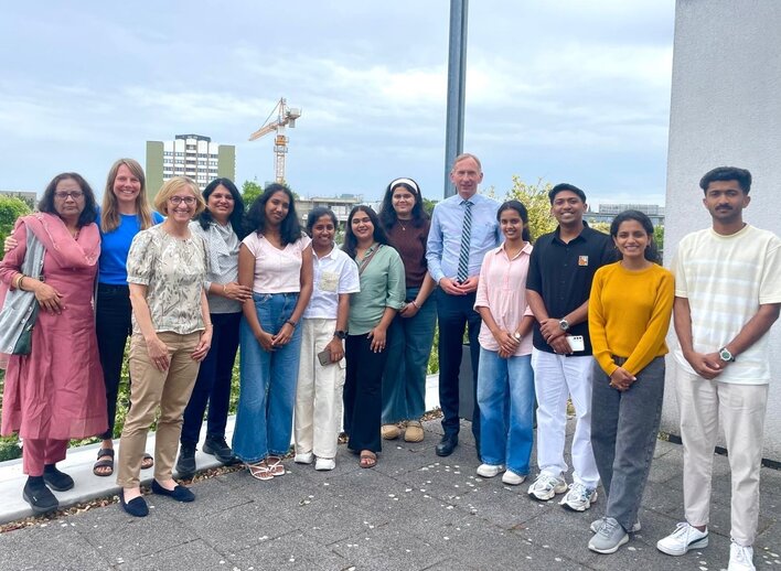 Acht Studierende und zwei Dozierende der CHRIST (Deemed to be University) trafen sich im Juni 2025 im Rahmen einer Exkursion zur katho Münster mit der Rektorin Prof. Dr. Barbara Schermaier-Stöckl und dem Kanzler Bernward Robrecht.