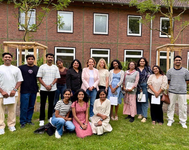 Die indischen Exkursionsteilnehmenden zusammen mit drei der vier Incoming Students der CHRIST am Campus der katho in Münster: Nikhil Santosh (2. v. l. hinten), Harshita Sreedhar (4. v. l. hinten), Cyril Kurian Philip (1. v. r. hinten); nicht auf dem Bild: Abel Jacob, er hat das Foto gemacht. Zudem: Prof.in Dr. Princy Thomas (5. v. l. hinten), Dekanin des Standortes Münster Prof.in Dr.in Anja Kannegießer (6. v. l. hinten), Prof.in Dr.in Grit Höppner (7. v. l. hinten) und Prof.in Dr.in Hemalatha K (4. v. r. hinten).