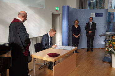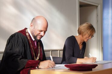 Prof. Dr. Aaron Langenfeld (l.), Rektor der Theologischen Fakultät Paderborn, mit Prof.in Dr.in Barbara Schermaier-Stöckl (r.), Rektorin der Katholischen Hochschule Nordrhein-Westfalen, unterzeichnen die Vereinbarung. (Foto: ThF-PB)