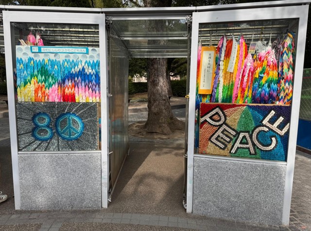 In Gedenken an die japanische Schülerin Sadako Sasaki, die 1955 als Folge des Atombombenabwurfs mit zwölf Jahren an Leukämie verstarb, hängten die Besucher_innen selbstgemachte Origami-Kranich-Ketten auf – so auch die Kölner katho-Besucher_innen. Der Kranich ist ein Symbol der internationalen Friedensbewegung und des Widerstands gegen den Atomkrieg.
